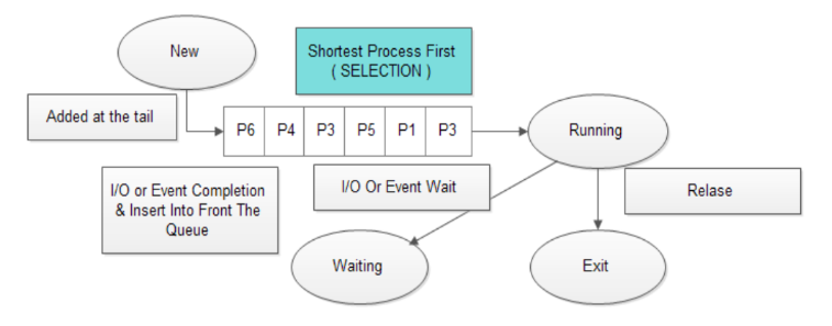 프로세스를 CPU 처리 시간이 짧은 순서대로 CPU에 할당하는 방식이다. 주로 평균 응답 시간을 최소화하기 위해 사용한다. 그러나 CPU 처리 시간이 긴 프로세스는 계속 Ready Queue의 뒤로 밀려나기 때문에 무한 대기 현상이 발생할 수 있다. 이 상태를 기아 상태(Starvation; 스타베이션)이라고 한다. (FCFS의 Convoy Effect를 완화하려고 했더니 Starvation 발생,,? )