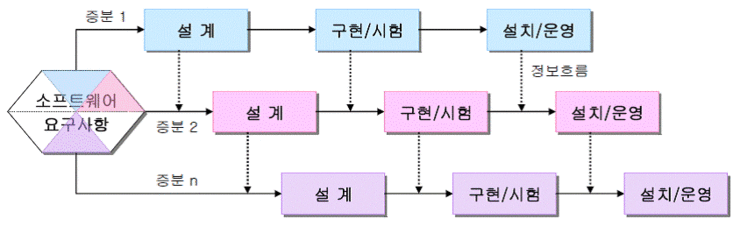 : 한 시스템을 기능별 분리해 여러 서브 시스템으로 쪼갠다. 쪼개진 서브 시스템을 구현하고 릴리즈하고 또 다른 서브 시스템을 구현 하고 릴리즈 해나간다. 이를 증분형 모델이라고 한다.