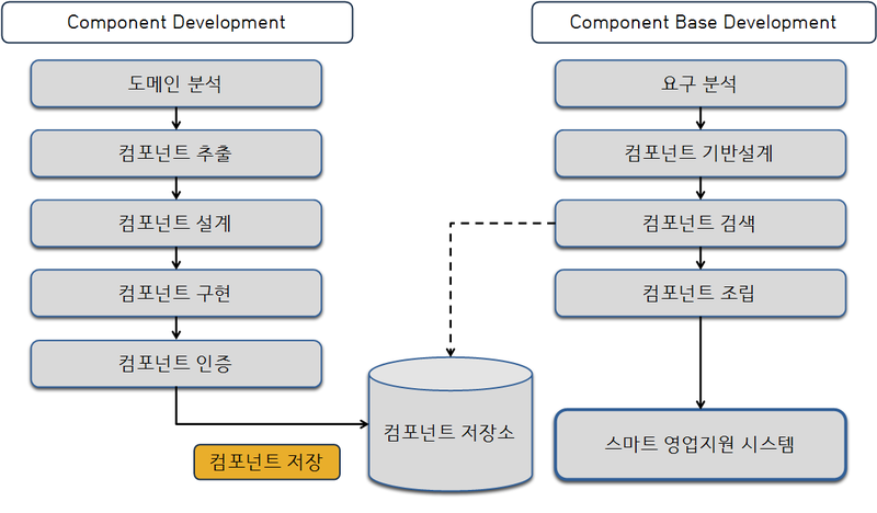 : 개발된 S/W 컴포넌트를 조립, 시스템을 개발하여 객체지향의 단점인 S/W 재사용성을 극대화한 개발 방법론이다. 컴포넌트는 인터페이스로 접근 가능하고 독립적인 기능을 수행하는 모듈로써 교체가 가능한 소프트웨어 부품이다.