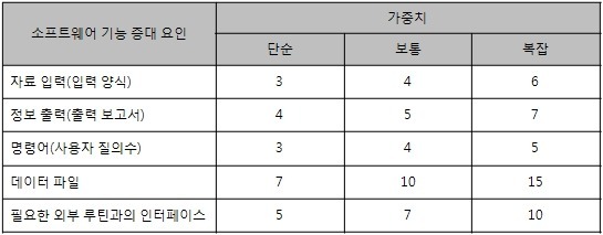 - 소프트웨어의 기능을 증대시키는 요인별로 기능 점수(FP)를 구한 후, 비용을 산정하는 기법