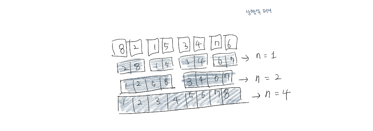 상향식 머지 정렬은 작은 부분 배열들을 한 번의 순회로 병합할 수 있도록 병합하는 순서를 조정하는 것이다. 그 다음 순회에서 더 커진 부분 배열들을 짝지어서 병합한다. 이러한 방법으로 부분 배열의 크기를 늘려가면서 머지 정렬을 수행한다.