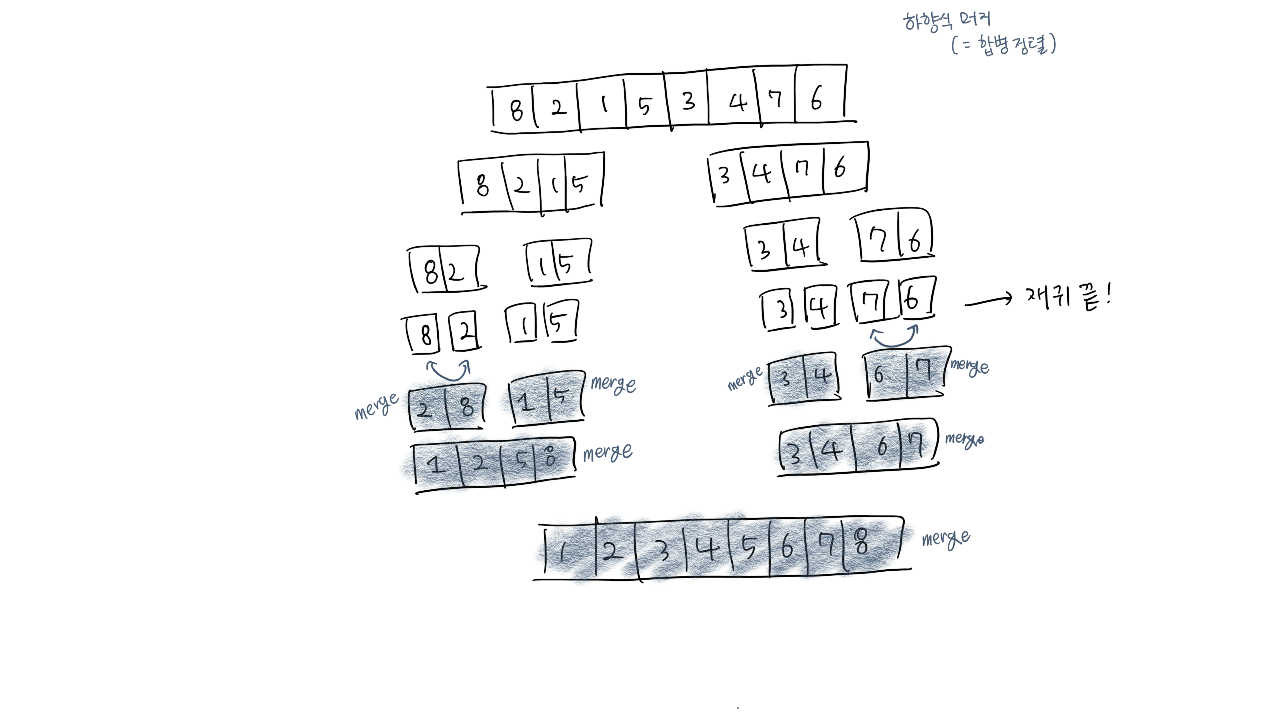 하향식 머지 정렬은 배열이 주어졌을 때, 배열을 더 이상 나눌 수 없을 때까지 나누고 배열이 더 이상 나누어질 수 없을 때 머지 정렬을 실행한다.
